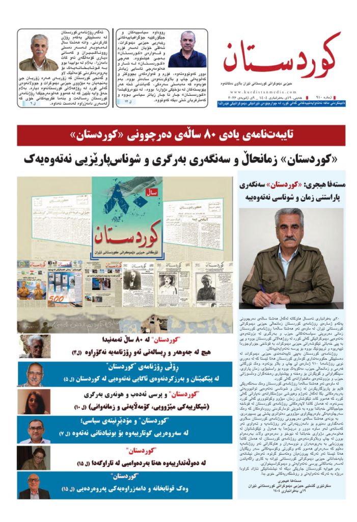 ژمارە ۹۱۰ی “کوردستان”، زمانحاڵی حیزبی دێموکراتی کوردستانی ئێران تایبەت بە نیوەی یەکەمی مانگی بەفرانبار چاپ و بڵاو بۆوە.